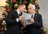 Церемония открытия ежегодной всероссийской акции "Елка желаний" с участием представителей всех фракций Государственной думы (ГД) России. Председатель комитета ГД России по молодежной политике Артем Метелев (слева) и руководитель фракции "Единая Россия" в ГД России Владимир Васильев (справа) во время церемонии.