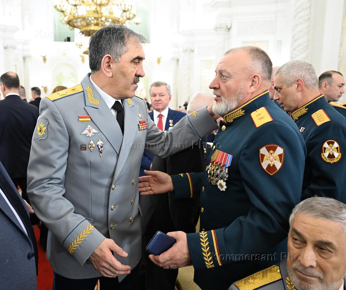 Празднование Дня Героев Отечества. Церемония вручения звания Героям России и медали "Золотая Звезда" президентом России Владимиром Путиным в Кремле. Заместитель министра обороны России Юнус-Бек Евкуров (слева) и командир полка полиции специального назначения имени Героя России Ахмата-Хаджи Кадырова МВД по Чеченской Республике Замид Чалаев (справа) перед началом церемонии.