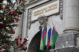 Виды Москвы. Жанровая фотография. Новогодние декорации у памятника писателю Федору Достоевскому перед зданием Российской государственной библиотеки (РГБ).