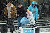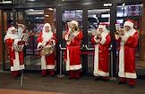 Виды Москвы. Жанровая фотография. Музыканты в костюмах Дедов Морозов во время уличного выступления.