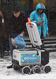 Виды Москвы. Жанровая фотография. Сотрудник российского сервиса быстрой доставки продуктов и товаров первой необходимости на дом или в офис "Яндекс Лавка" во время укладки заказа в короб робота-доставщика.