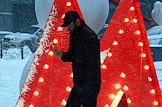 Виды Москвы. Жанровая фотография. Мужчина с мобильным телефоном на фоне новогодней декорации на территории Московского международного делового центра "Москва-Сити".