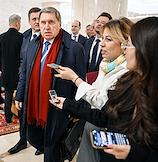 Рабочая поездка президента России Владимира Путина в Туркменистан. Пленарное заседание международного форума на тему "Мир и доверие: единство целей в интересах устойчивого будущего" в конгресс-центре Туркменистана. Помощник президента России Юрий Ушаков (в центре) перед началом заседания.