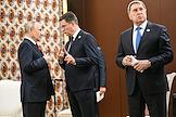 Рабочая поездка президента России Владимира Путина в Туркменистан. Пленарное заседание международного форума на тему "Мир и доверие: единство целей в интересах устойчивого будущего" в конгресс-центре Туркменистана. Глава Республики Татарстан Рустам Минниханов (слева), заместитель председателя правительства России Александр Новак (в центре) и заместитель руководителя администрации президента России, пресс-секретарь президента России Дмитрий Песков (справа) перед началом заседания.