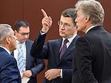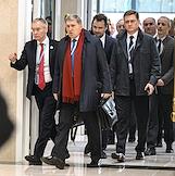 Рабочая поездка президента России Владимира Путина в Туркменистан. Пленарное заседание международного форума на тему "Мир и доверие: единство целей в интересах устойчивого будущего" в конгресс-центре Туркменистана. Помощник президента России Юрий Ушаков (второй слева) и заместитель председателя правительства России Александр Новак (в центре) перед началом заседания.
