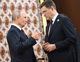 Рабочая поездка президента России Владимира Путина в Туркменистан. Пленарное заседание международного форума на тему "Мир и доверие: единство целей в интересах устойчивого будущего" в конгресс-центре Туркменистана. Президент России Владимир Путин (слева) и заместитель председателя правительства России Александр Новак (справа) перед началом заседания.