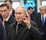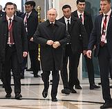 Рабочая поездка президента России Владимира Путина в Туркменистан. Пленарное заседание международного форума на тему "Мир и доверие: единство целей в интересах устойчивого будущего" в конгресс-центре Туркменистана. Президент России Владимир Путин (в центре) перед началом заседания.