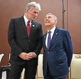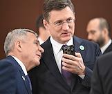 Рабочая поездка президента России Владимира Путина в Туркменистан. Пленарное заседание международного форума на тему "Мир и доверие: единство целей в интересах устойчивого будущего" в конгресс-центре Туркменистана. Глава Республики Татарстан Рустам Минниханов (слева) и заместитель председателя правительства России Александр Новак (справа) перед началом заседания.