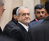 Рабочая поездка президента России Владимира Путина в Туркменистан. Пленарное заседание международного форума на тему "Мир и доверие: единство целей в интересах устойчивого будущего" в конгресс-центре Туркменистана. Президент Ирана Масуд Пезешкиан (в центре) перед началом заседания.