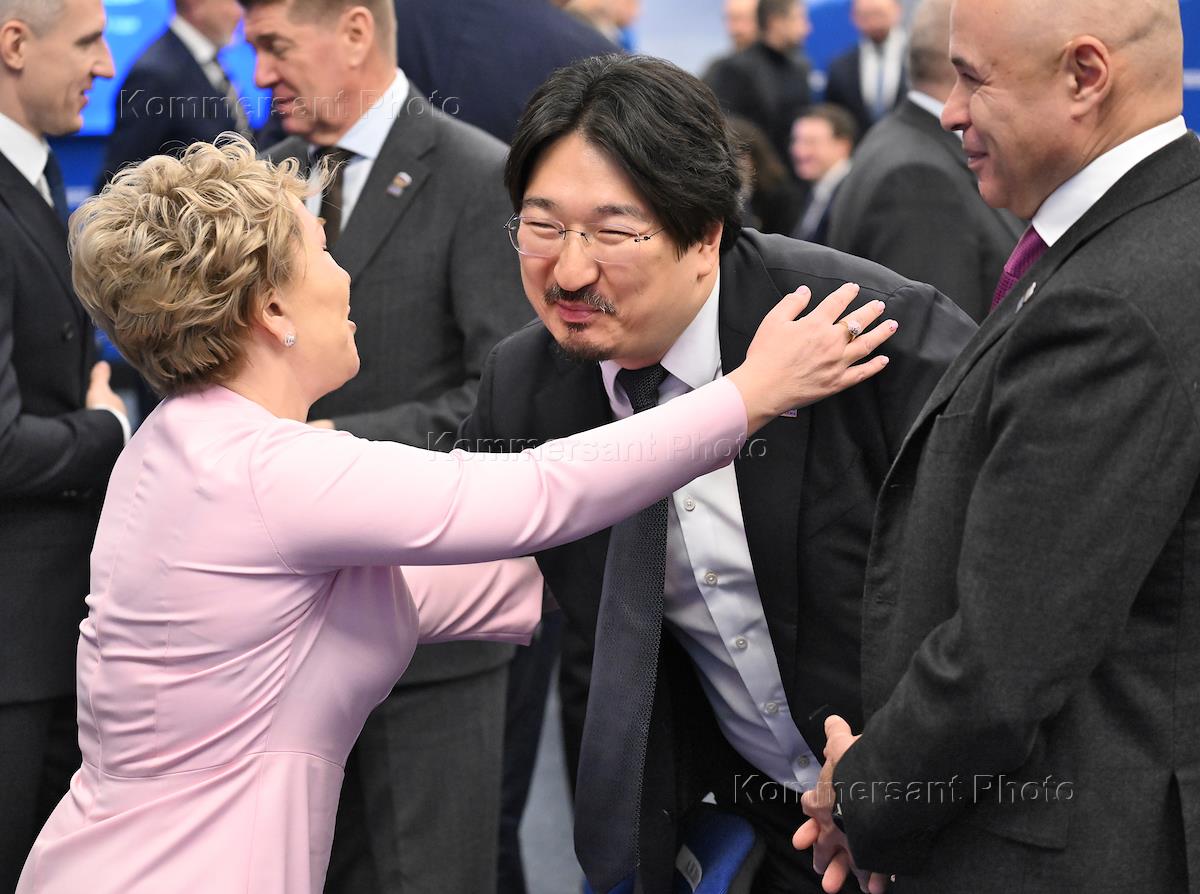 Заседание Генерального Совета партии "Единая Россия" в Центральном исполкоме партии "Единая Россия". Слева направо: представитель в Совете Федерации от исполнительного органа государственной власти Кировской области Вячеслав Тимченко, заместитель председателя Государственной думы России Анна Кузнецова и губернатор Кировской области Александр Соколов во время заседания.
