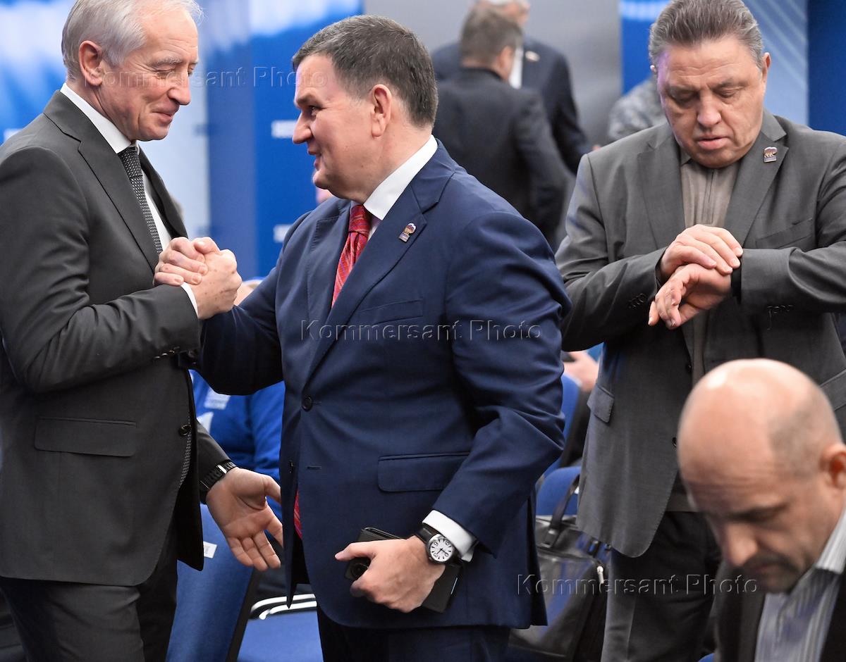 Заседание Генерального Совета партии "Единая Россия" в Центральном исполкоме партии "Единая Россия". Первый заместитель председателя комитета Государственной думы России по охране здоровья Бадма Башанкаев (в центре) и губернатор Липецкой области Игорь Артамонов (справа) во время заседания.