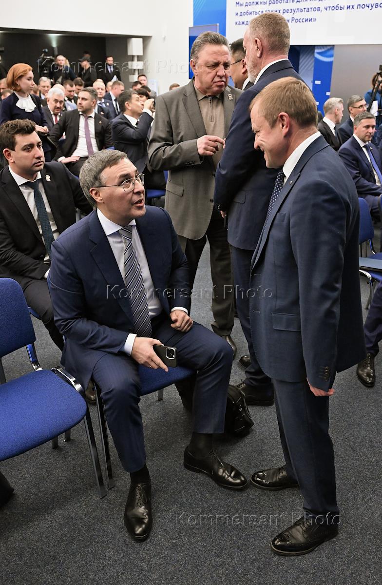 Заседание Генерального Совета партии "Единая Россия" в Центральном исполкоме партии "Единая Россия". Представитель в Совете Федерации (СФ) России от исполнительного органа государственной власти Кировской области Вячеслав Тимченко (справа) и представитель в СФ России от исполнительного органа государственной власти Ленинградской области Сергей Перминов (в центре) во время заседания.