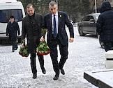 Церемония прощания с послом России в КНДР Александром Мацегорой в Зале прощаний Центральной клинической больницы. Генеральный директор МИД России Алексей Островский (слева) и председатель Либерально-демократической партии России (ЛДПР), руководитель фракции ЛДПР в Государственной думе России Леонид Слуцкий (справа) на церемонии.