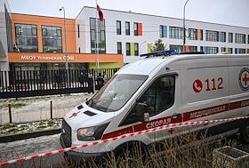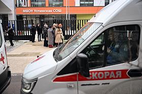 Ситуация рядом с общеобразовательной школой города Одинцово. Успенская СОШ, Горковская средняя школа, корпус № 2, поселок Горки-2. В общеобразовательной школе в поселке Горки-2 Одинцовского округа школьник напал с ножом на учеников и охранника. Сотрудники скорой медицинской помощи у здания школы.