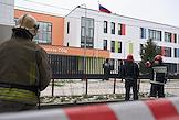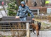Ситуация рядом с общеобразовательной школой города Одинцово. Успенская СОШ, Горковская средняя школа, корпус № 2, поселок Горки-2. В общеобразовательной школе в поселке Горки-2 Одинцовского округа школьник напал с ножом на учеников и охранника. Сотрудник полиции с собакой у здания школы.