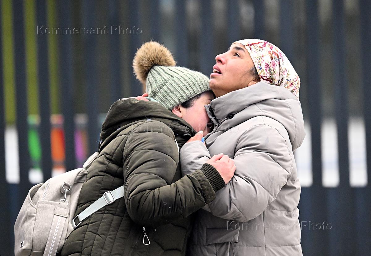 Ситуация рядом с общеобразовательной школой города Одинцово. Успенская СОШ, Горковская средняя школа, корпус № 2, поселок Горки-2. В общеобразовательной школе в поселке Горки-2 Одинцовского округа школьник напал с ножом на учеников и охранника. Родственники погибшего школьника у здания школы.