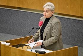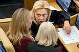 Пленарное заседание Государственной думы (ГД) России. Слева направо: член комитета ГД России по просвещению Лариса Тутова, председатель комитета ГД России по развитию гражданского общества, вопросам общественных и религиозных объединений Ольга Тимофеева и первый заместитель председателя комитета ГД России по экономической политике Надежда Школкина во время заседания.
