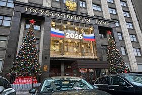 Пленарное заседание Государственной думы (ГД) России. Жанровая фотография. Фасад здания ГД России, украшенный к Новому году.