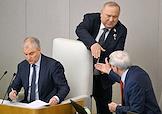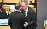 Пленарное заседание Государственной думы (ГД) России. Председатель комитета ГД России по обороне Андрей Картаполов (слева) и первый заместитель председателя комитета ГД России по международным делам Вячеслав Никонов (в центре) во время заседания.