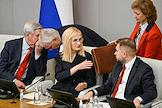Пленарное заседание Государственной думы (ГД) России. Слева направо: заместитель председателя комитета ГД России по защите семьи, вопросам отцовства, материнства и детства Виталий Милонов, председатель комитета ГД России по просвещению Ирина Белых и первый заместитель председателя комиссии ГД России по Регламенту и обеспечению деятельности Государственной думы Татьяна Дьяконова во время заседания.
