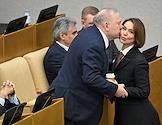 Пленарное заседание Государственной думы (ГД) России. Заместитель председателя комитета ГД России по развитию гражданского общества, вопросам общественных и религиозных объединений Владимир Шаманов (в центре) и первый заместитель председателя комитета ГД России по малому и среднему предпринимательству Альфия Когогина (справа) во время заседания.