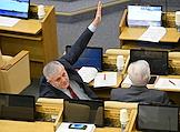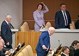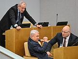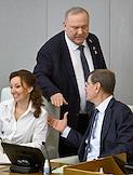 Пленарное заседание Государственной думы (ГД) России. Слева направо: член комитета ГД России по физической культуре и спорту Сергей Неверов, первый заместитель председателя комитета ГД России по безопасности и противодействию коррупции Рахим Азимов и член комитета ГД России по экологии, природным ресурсам и охране окружающей среды Артур Таймазов во время заседания.