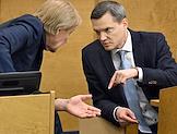 Пленарное заседание Государственной думы (ГД) России. Председатель комитета ГД России по развитию гражданского общества, вопросам общественных и религиозных объединений Яна Лантратова (слева) и заместитель председателя комитета ГД России по конституционному законодательству и государственному строительству Дмитрий Вяткин (справа) во время заседания.
