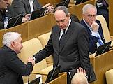 Пленарное заседание Государственной думы (ГД) России. Первый заместитель председателя комитета ГД по труду, социальной политике и делам ветеранов Николай Коломейцев (слева) и член комитета ГД России по охране здоровья Николай Осадчий (справа) во время заседания.