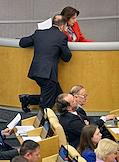 Пленарное заседание Государственной думы (ГД) России. Член комитета ГД России по строительству и жилищно-коммунальному хозяйству Вадим Булавинов (слева) и первый заместитель председателя комитета ГД России по государственному строительству и законодательству Даниил Бессарабов (справа) во время заседания.