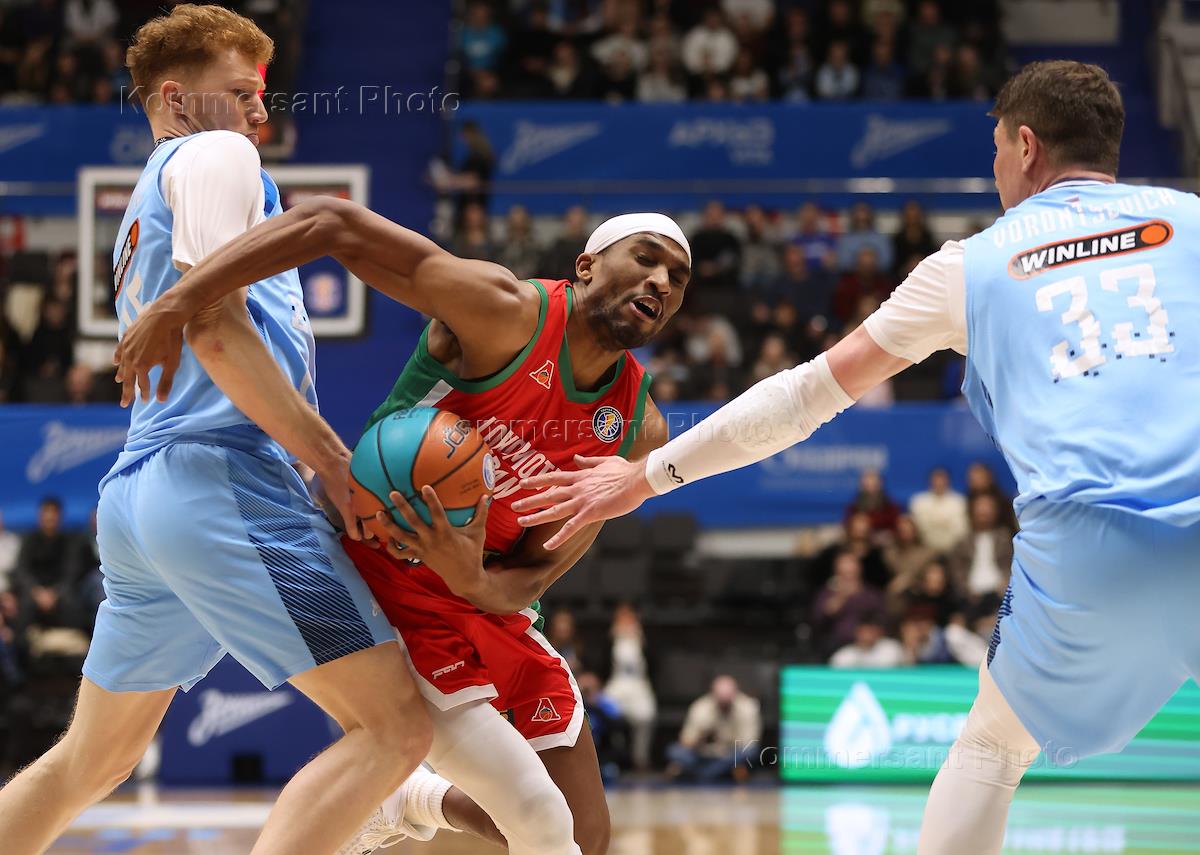 Единая лига ВТБ по баскетболу. Матч между командами "Зенит" (Санкт-Петербург) - "Локомотив-Кубань" (Краснодар) в КСК "Арена". Игрок команды "Локомотив-Кубань" Джеремайя Мартин (слева) и игрок команды "Зенит" Владислав Емченко (в центре) во время матча.