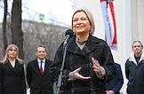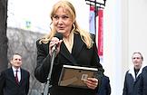 Церемония открытия скульптурной композиции, посвященной создателям многосерийного телефильма "Семнадцать мгновений весны", в сквере у главного входа на Киностудию имени Горького. Министр культуры России Ольга Любимова во время церемонии.