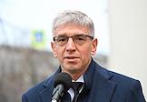 Церемония открытия скульптурной композиции, посвященной создателям многосерийного телефильма "Семнадцать мгновений весны", в сквере у главного входа на Киностудию имени Горького. Министр правительства Москвы, руководитель Департамента культуры города Москвы Алексей Фурсин во время церемонии.
