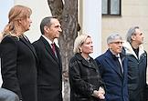 Церемония открытия скульптурной композиции, посвященной создателям многосерийного телефильма "Семнадцать мгновений весны", в сквере у главного входа на Киностудию имени Горького. Слева направо: дочь актера Вячеслава Тихонова актриса Анна Тихонова, директор Службы внешней разведки России Сергей Нарышкин, министр культуры России Ольга Любимова, министр правительства Москвы, руководитель Департамента культуры города Москвы Алексей Фурсин и председатель правления Союза художников России, скульптор Андрей Ковальчук во время церемонии.