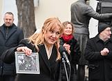 Церемония открытия скульптурной композиции, посвященной создателям многосерийного телефильма "Семнадцать мгновений весны", в сквере у главного входа на Киностудию имени Горького. Дочь актера Вячеслава Тихонова актриса Анна Тихонова во время церемонии.