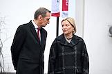Церемония открытия скульптурной композиции, посвященной создателям многосерийного телефильма "Семнадцать мгновений весны", в сквере у главного входа на Киностудию имени Горького. Министр культуры России Ольга Любимова (справа) и директор Службы внешней разведки России Сергей Нарышкин (слева) во время церемонии.