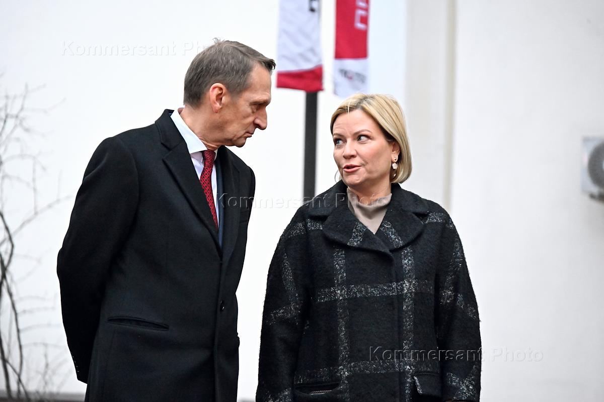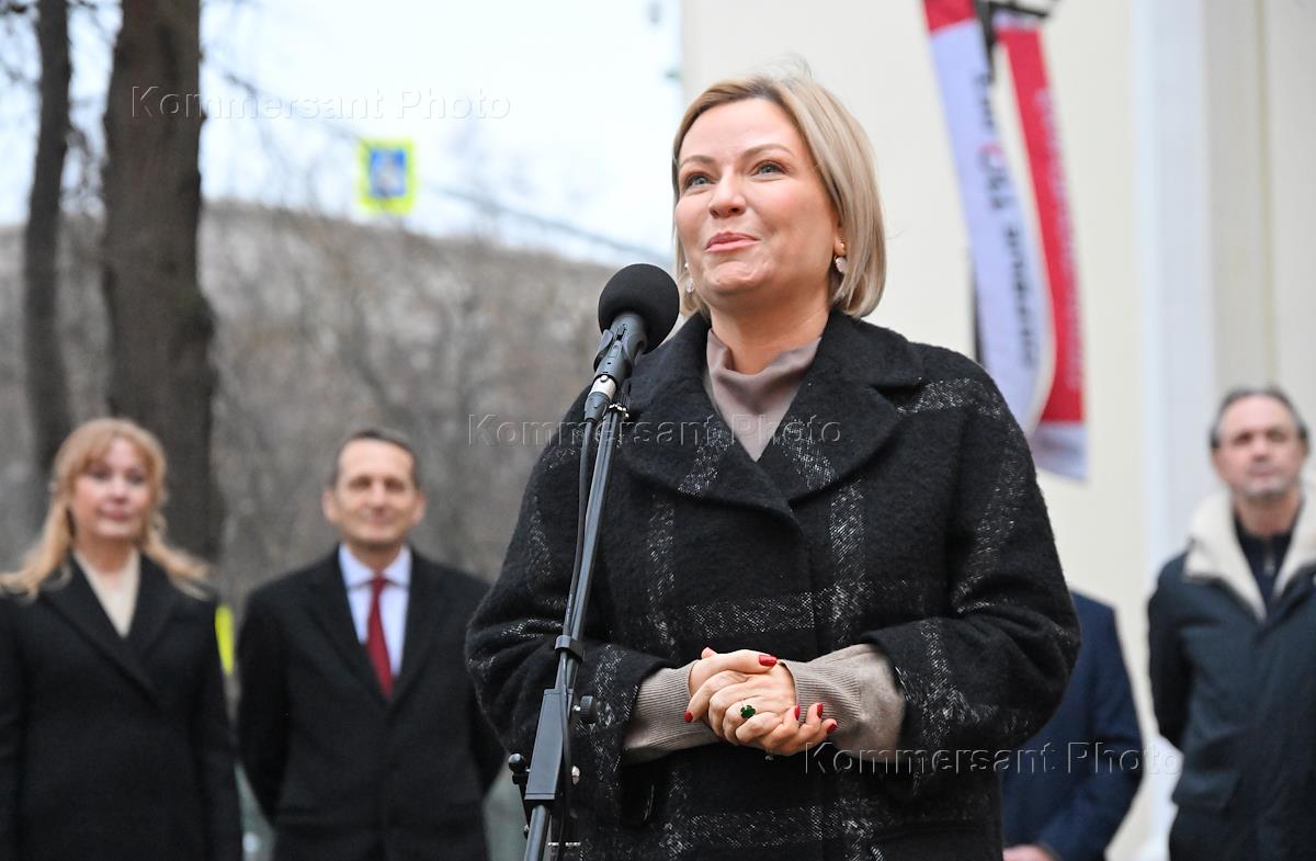 Церемония открытия скульптурной композиции, посвященной создателям многосерийного телефильма "Семнадцать мгновений весны", в сквере у главного входа на Киностудию имени Горького. Министр культуры России Ольга Любимова (справа) и директор Службы внешней разведки России Сергей Нарышкин (слева) во время церемонии.