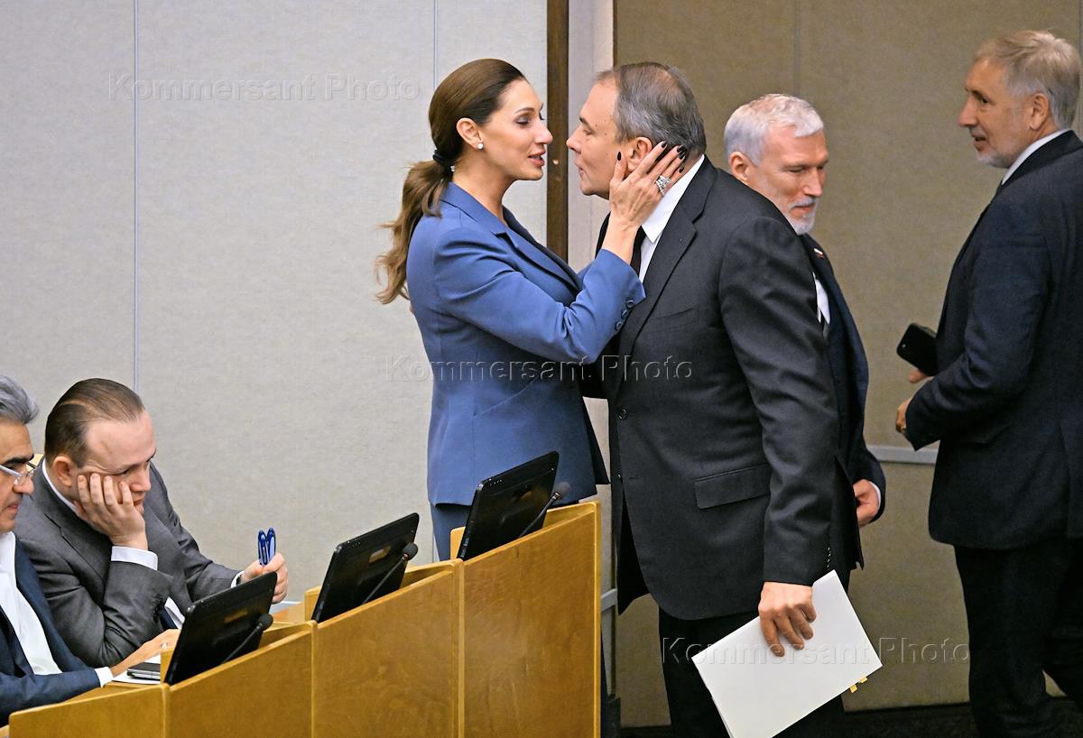 Plenary session of the State Duma of Russia. First Deputy Chair of the State Duma Committee on Culture Elena Drapeko (left) and member of the State Duma Committee on Security and Anti-Corruption Alexander Terentyev (center) during the session.