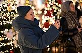Виды Москвы. Новогоднее украшение города. Жанровая фотография. Женщина фотографируют новогоднюю инсталляцию во дворе исторического здания НИИ скорой помощи имени Н.В.Склифосовского (Странноприимный дом).