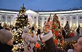 Виды Москвы. Новогоднее украшение города. Жанровая фотография. Новогодняя инсталляция во дворе исторического здания НИИ скорой помощи имени Н.В.Склифосовского (Странноприимный дом). Девушки фотографируются у новогодних елок.