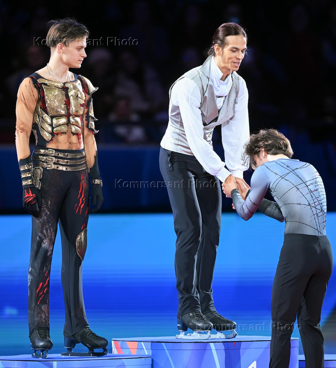 Чемпионат России по фигурному катанию во Дворце спорта "Юбилейный". Церемония награждения победителей соревнований в мужском одиночном катании. Слева направо: фигуристы Евгений Семененко, Петр Гуменник и Марк Кондратюк во время церемонии.