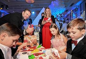 Новогодняя елка "Бал волшебных сказок" от Radio Monte Carlo в отеле Four Seasons Moscow. Предприниматель и сооснователь благотворительного фонда "Друзья" Ян Яновский (в центре) его супруга психолог Лена Фейгин (слева) с детьми на елке.