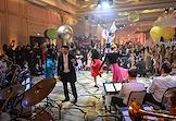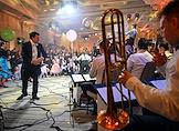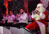 Новогодняя елка "Бал волшебных сказок" от Radio Monte Carlo в отеле Four Seasons Moscow. Жанровая фотография. Музыкант оркестра в костюме Деда Мороза играет на трубе.