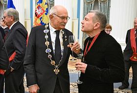 Церемония вручения государственных наград в Екатерининском зале Кремля. Председатель Союза кинематографистов России, кинорежиссер Никита Михалков (в центре) и телеведущий Владимир Соловьев после церемонии.