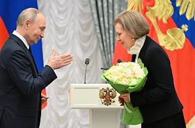 Церемония вручения государственных наград в Екатерининском зале Кремля. Президент России Владимир Путин (слева) и руководитель Федеральной службы по надзору в сфере защиты прав потребителей и благополучия человека - главный государственный санитарный врач России Анна Попова во время церемонии.