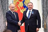 Церемония вручения государственных наград в Екатерининском зале Кремля. Президент России Владимир Путин (слева) и президент акционерного общества "Научно-производственный центр "МАКС" Виктор Полищук во время церемонии.