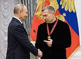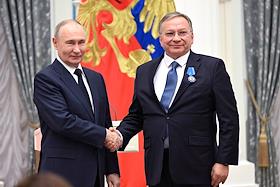 Церемония вручения государственных наград в Екатерининском зале Кремля. Президент России Владимир Путин (слева) и генеральный директор Спортивно-развлекательного квартала "Парк легенд" Алексей Касатонов во время церемонии.