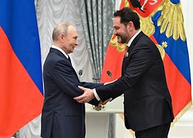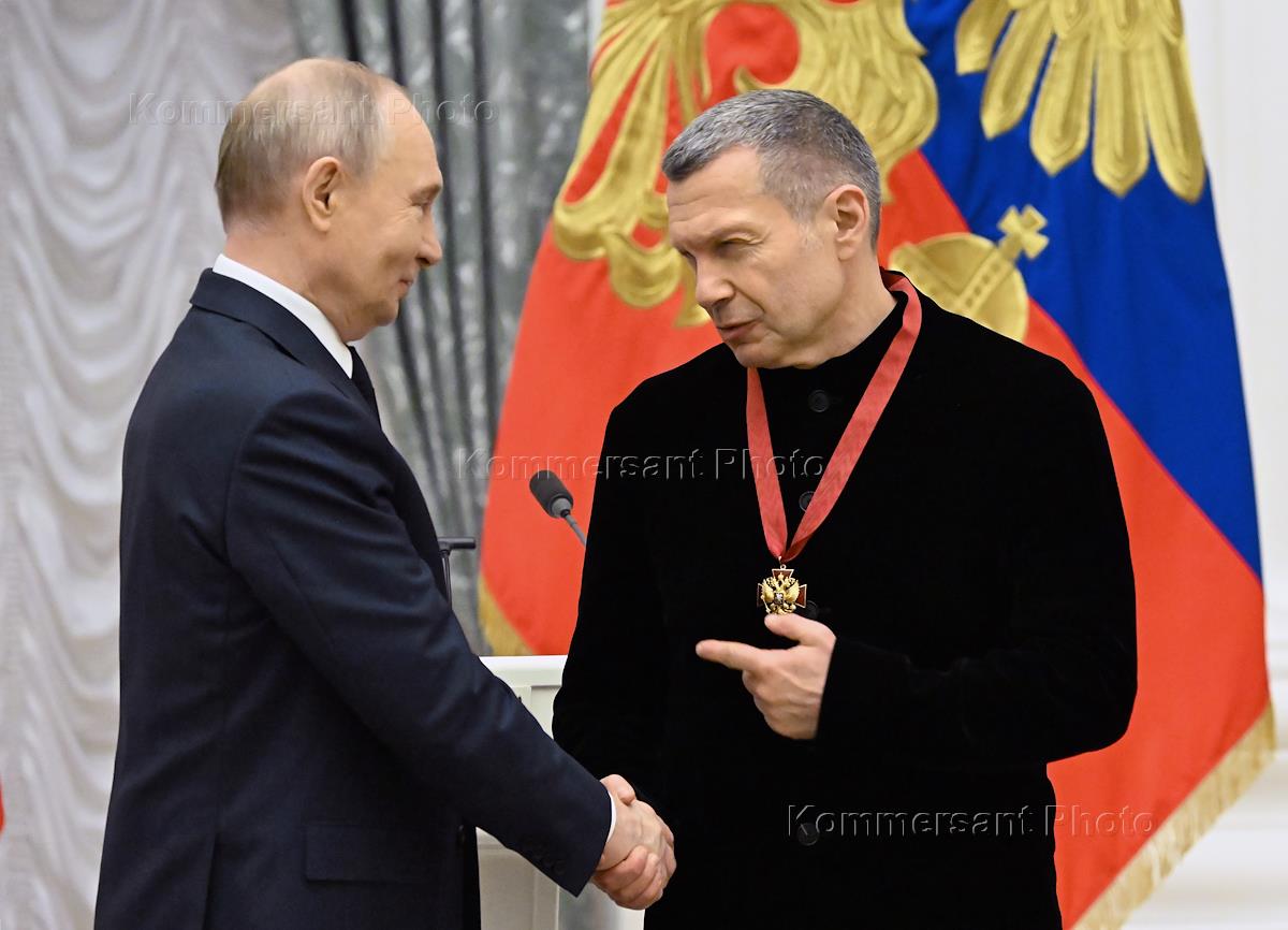 Церемония вручения государственных наград в Екатерининском зале Кремля. Президент России Владимир Путин (слева) и телеведущий Владимир Соловьев во время церемонии.
