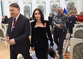 Церемония вручения государственных наград в Екатерининском зале Кремля. Генеральный директор Спортивно-развлекательного квартала "Парк легенд" Алексей Касатонов (слева) и директор телеканала ТНТ, заместитель гендиректора холдинга "Газпром-медиа", управляющий директор ГПМ РТВ Тинатин Канделаки (в центре) после окончания церемонии.