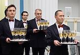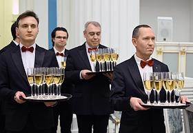 Церемония вручения государственных наград в Екатерининском зале Кремля. Жанровая фотография. Официанты на церемонии с бокалами с шампанским.