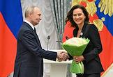 Церемония вручения государственных наград в Екатерининском зале Кремля. Президент России Владимир Путин (слева) и директор федерального государственного бюджетного учреждения "Национальный медицинский исследовательский центр сердечно-сосудистой хирургии имени А.Н. Бакулева" Елена Голухова (в центре) во время церемонии.